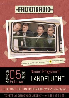 Die Musik hat die vier Musiker schon immer begleitet, natürlich erst recht, wenn sie Heimweh verspürten. Ein Ende ist weit und breit nicht in Sicht für die Musikanten aus Leidenschaft – ganz im Gegenteil: Am 5. Februar 2020 ab 19:30 unter dem Titel „Landflucht” stellen sie sich in den Dienst der guten Sache und spielen ein großes Benefizkonzert für die Österreichische Krebshilfe Salzburg. Zu erleben ist Faltenradio in der Bachschmiede, dem Kulturzentrum in Wals. Gespielt werden unter anderem Werke von Wolfgang Amadeus Mozart, Hannes Wader, Friedrich Gulda, John Williams, Bela Bartok und vielen mehr.