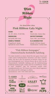 Nach dem großen Erfolg der letzten 3 Jahre und vielen Spenden zu Gunsten der Pink Ribbon Aktion der Krebshilfe Salzburg, setzt die Eder Collection ihre Tradition fort und veranstaltet am 28.09.2024 erneut einen Charityabend. Dieses Jahr wird der Abend noch um ein Benefizfußballspiel erweitert, das bereits am Vorabend in Saalfelden stattfinden wird. Es spielen die OldBoys Maria Alm gegen den FC Pinzgau Damen Auswahl. Weitere Infos direkt bei www.ederhotels.com (tanja(at)ederhotels.com)