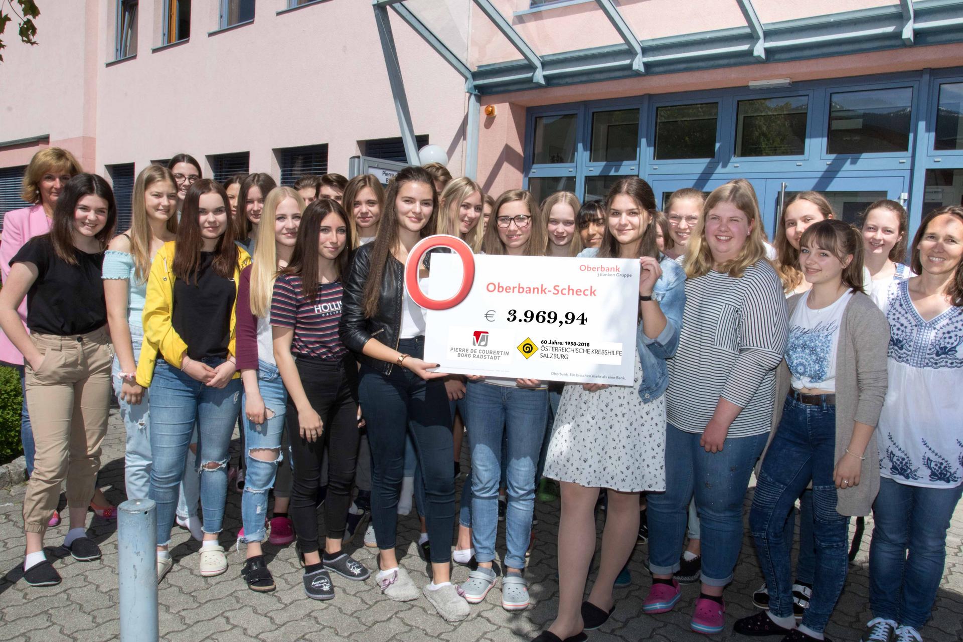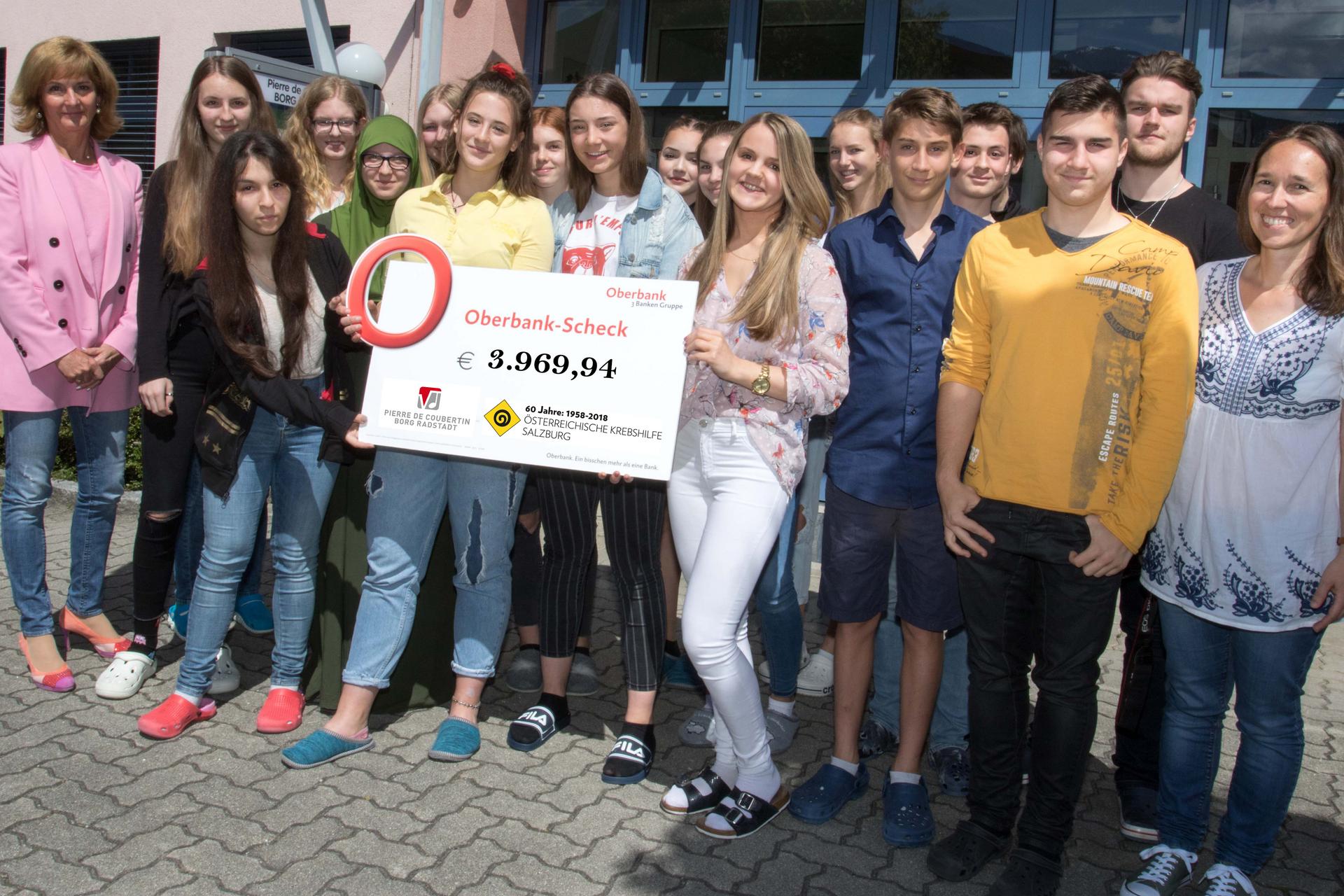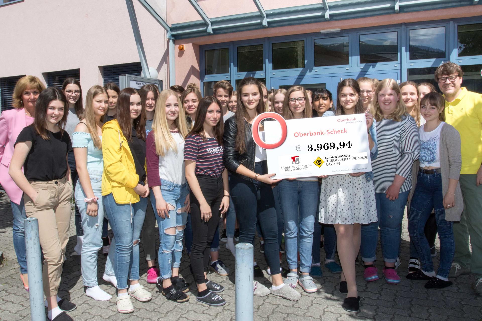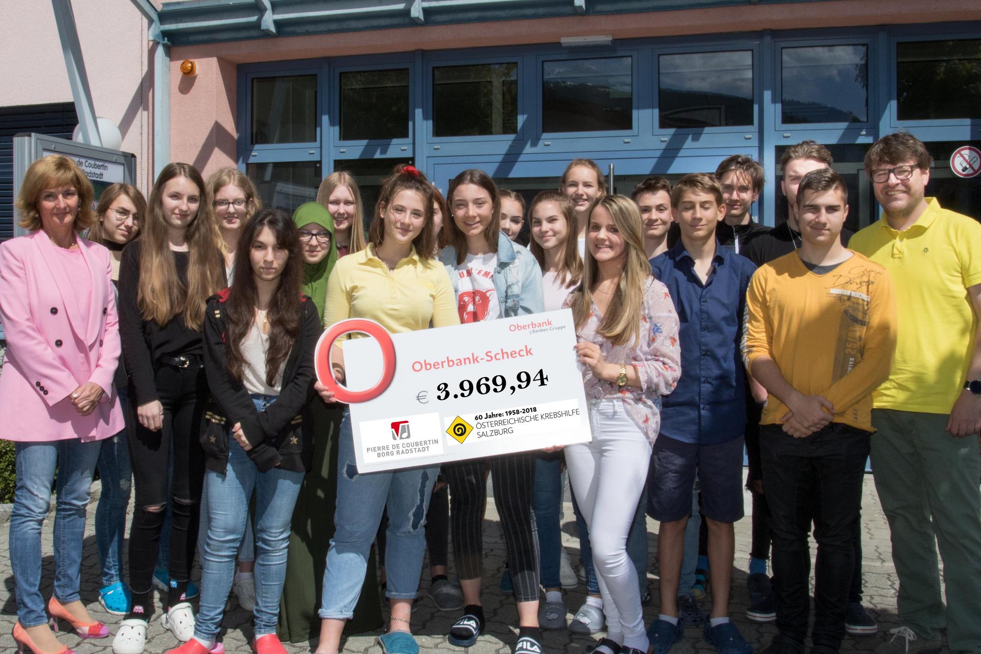 Schülerinnen und Schüler der 5. Klassen des Pierre de Coubertins Gymnasiums haben im Mai an der großen Krebshilfe Sammlung 2019 teilgenommen. Sie waren in ihren Heimatgemeinden unterwegs, um Spendengelder für die Österreichische Krebshilfe zu sammeln und damit krebskranken Menschen und ihren Familien zu helfen. Insgesamt wurden heuer dabei rund 4.000 Euro gespendet. „Ich bin überwältigt und möchte allen, die so tatkräftig gesammelt und gespendet haben unseren herzlichen Dank aussprechen. Die Schülerinnen und Schüler haben auch dieses Jahr wieder einen großen Baustein zur Finanzierung der Hilfe für an Krebs erkrankte Menschen im Pongau beigetragen“, freut sich Krebshilfe Geschäftsführer Stephan Spiegel bei der Scheckübergabe.
