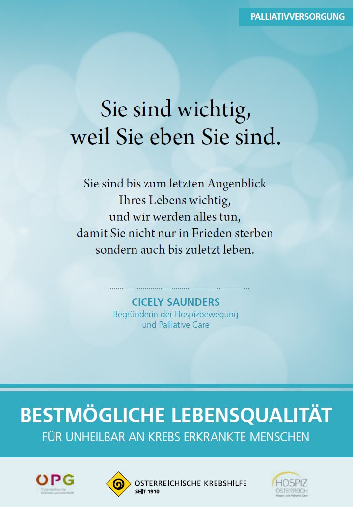 Die Österreichische Krebshilfe, Hospiz Österreich und die Österreichische Palliativgesellschaft präsentieren zum Weltkrebstag 2016 (4.2.) eine neue Broschüre, die Menschen mit fortgeschrittener Krebserkrankung einen detaillierten Überblick über das österreichweite Hilfsangebot gibt und Angehörige bei den vielen Fragen und Problemstellungen in der Begleitung und Pflege unterstützt.