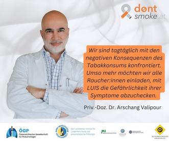 Der Online-Symptom-Check mit LUIS , dem virtuellen Lungenarzt, wird man von LUIS in wenigen Schritten durch mögliche Symptome und Beschwerden gelotst. Am Ende des Tests erhält man eine Einschätzung des momentanen Gesundheitszustandes. Plus Verlinkung zu den möglichen Angeboten für einen Rauchstopp vom Rauchfrei-Telefon bzw. zu dem/der nächsten Lungenfacharzt/ärztin.